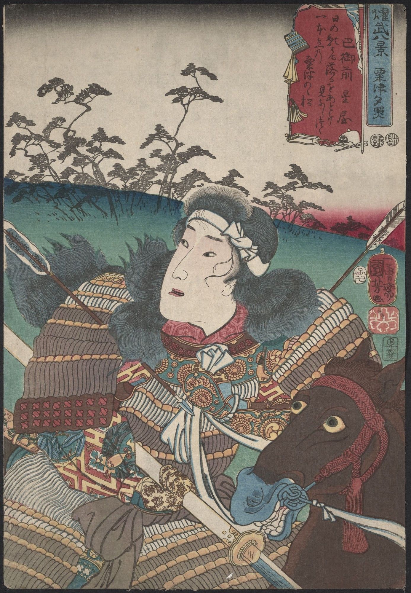 Utagawa Kuniyoshi (1797–1861), Tomoe Gozen riding away after the Battle of Awazu. Colour woodblock print, 1852. Photo © 2025 The Trustees of the British Museum.